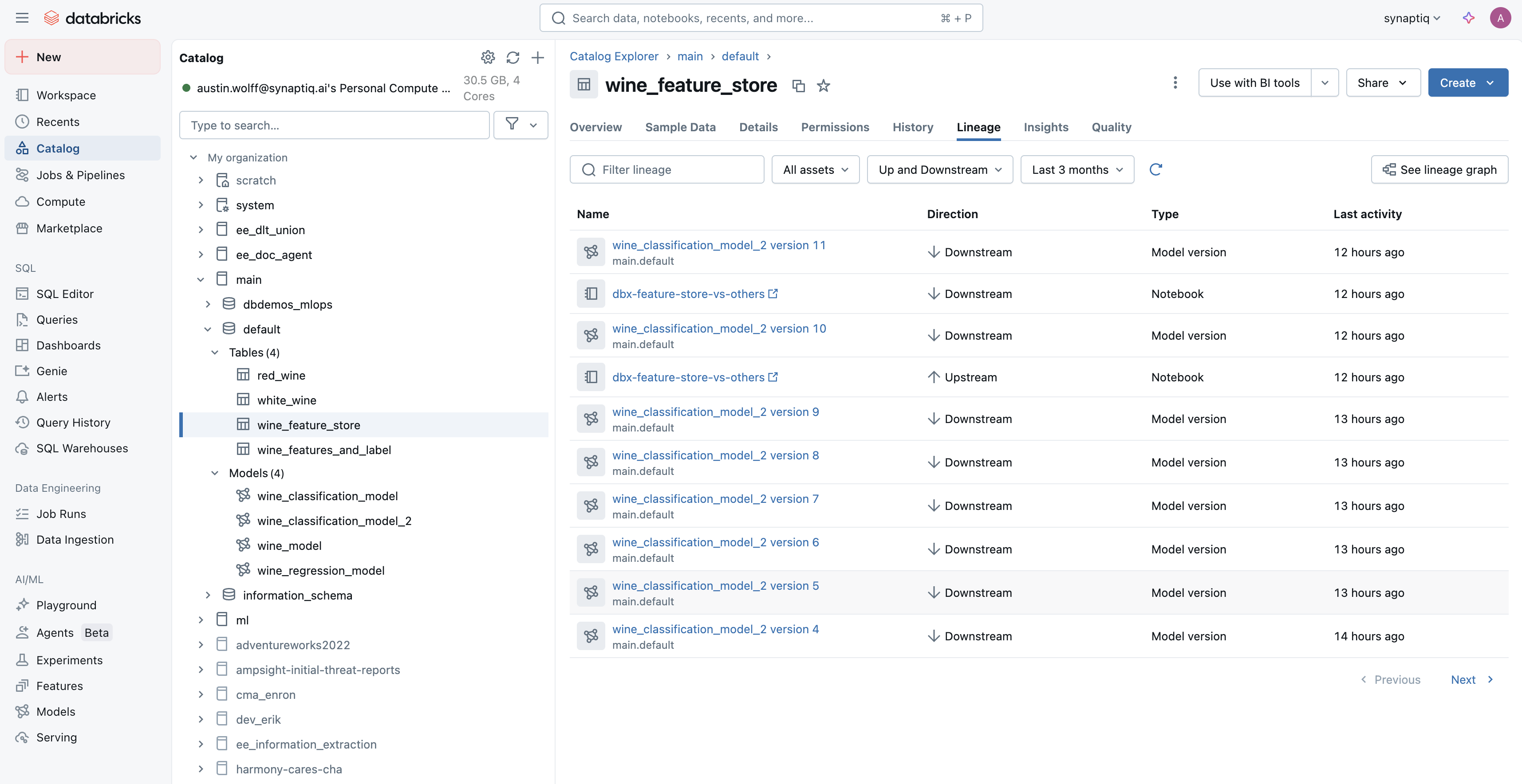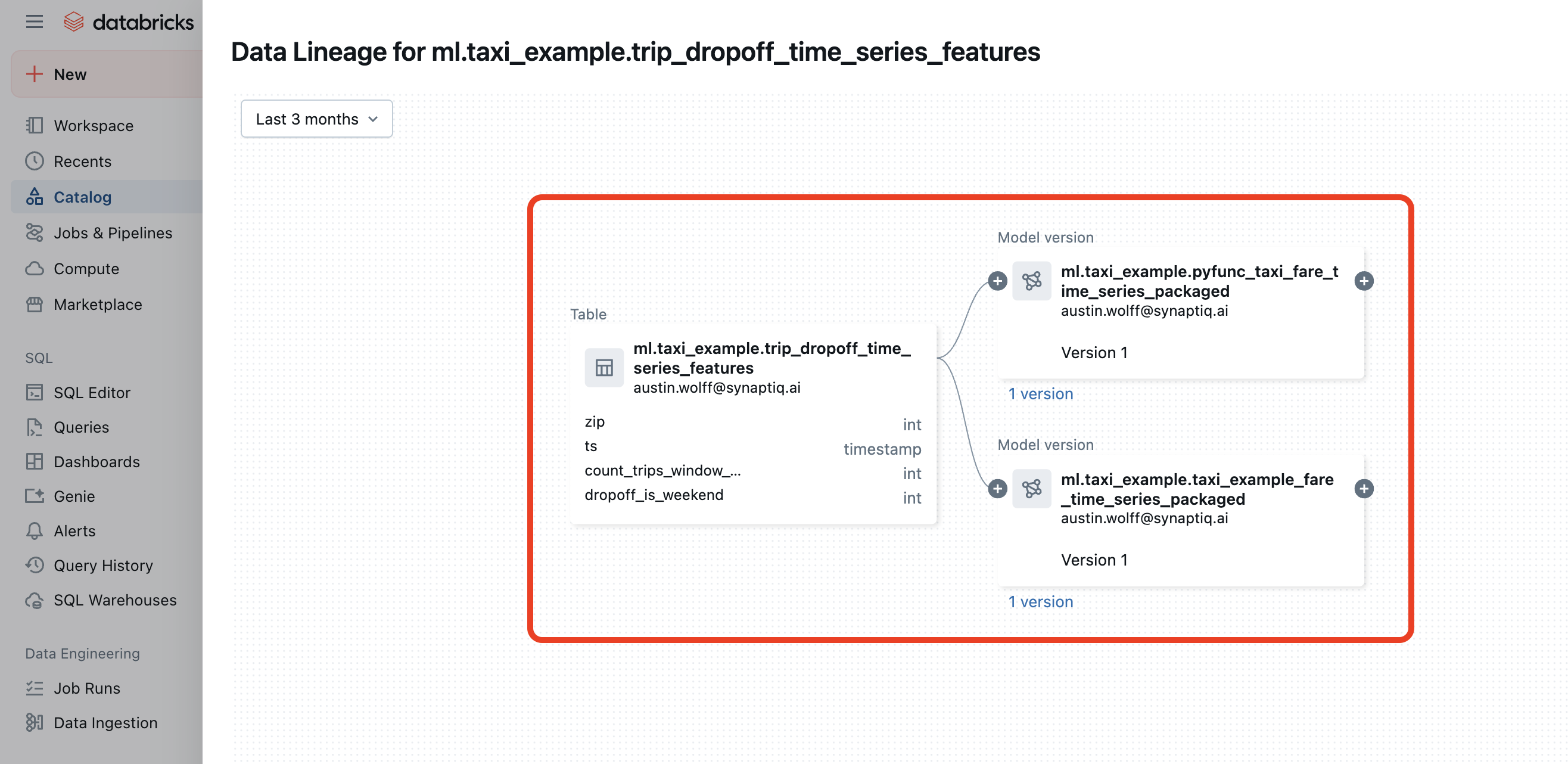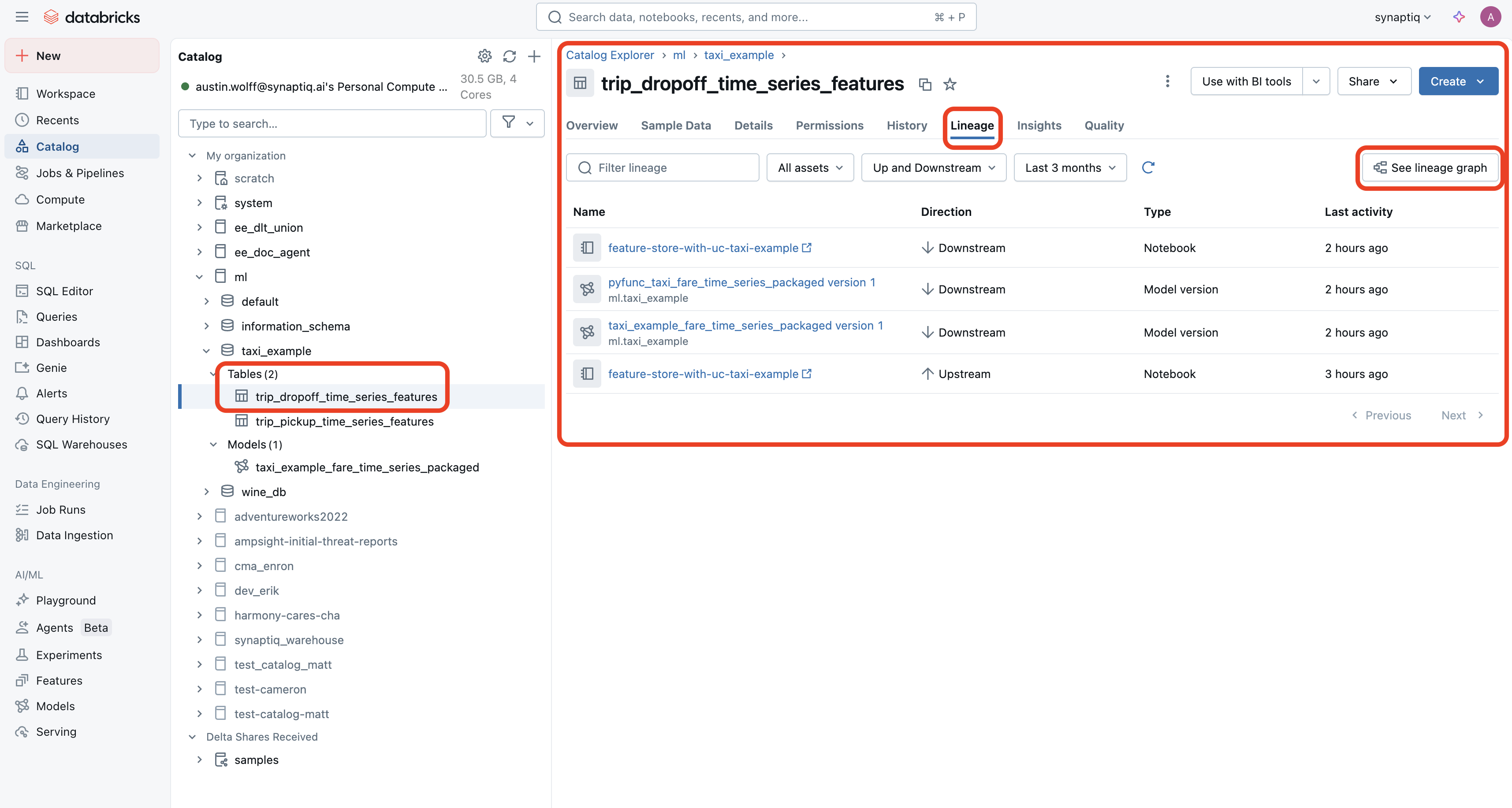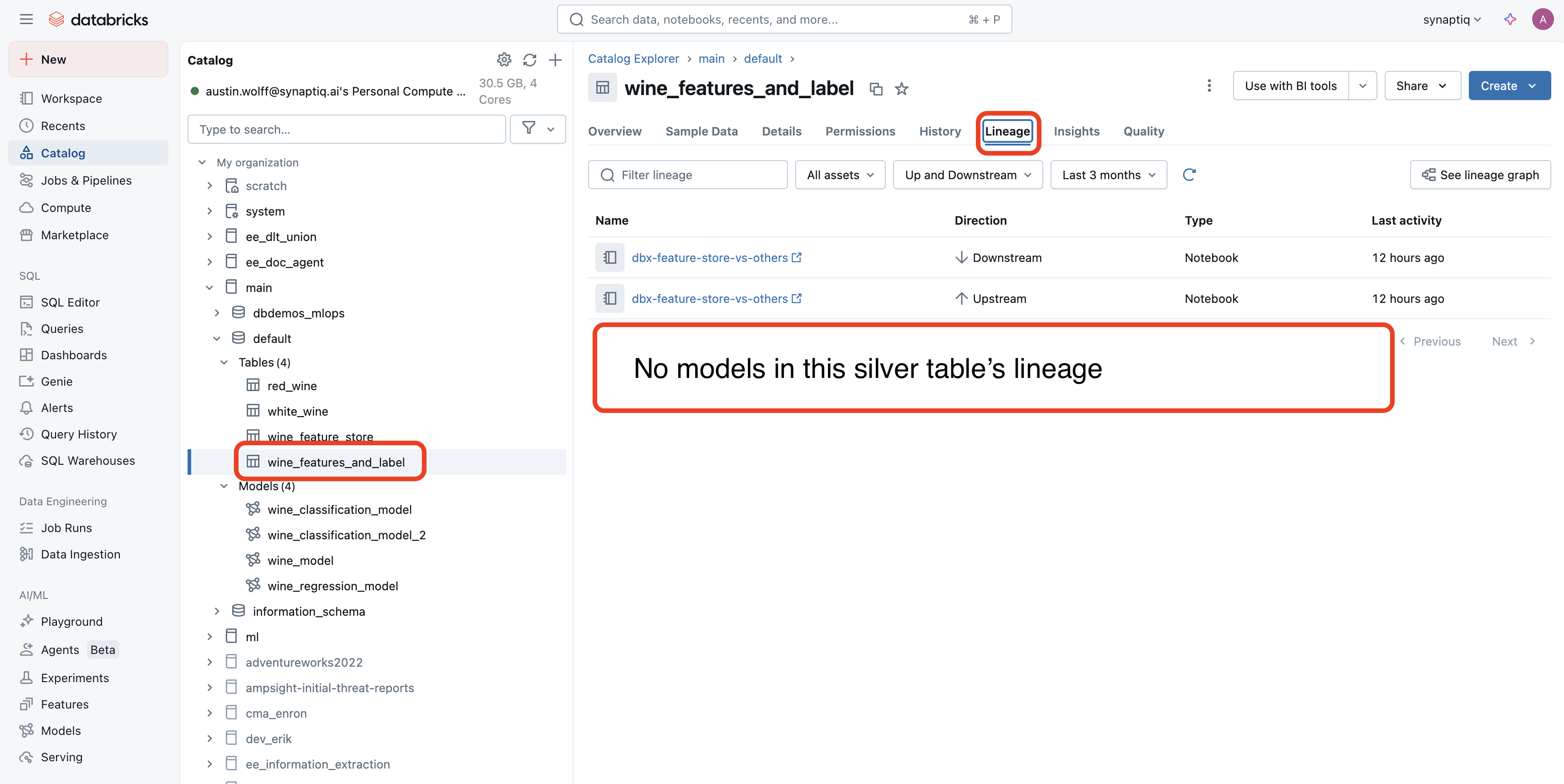 In other words, Feature Stores are Delta Tables wrapped with ML governance and lifecycle tools. Now, I’ve drawn attention to the Lineage tab: