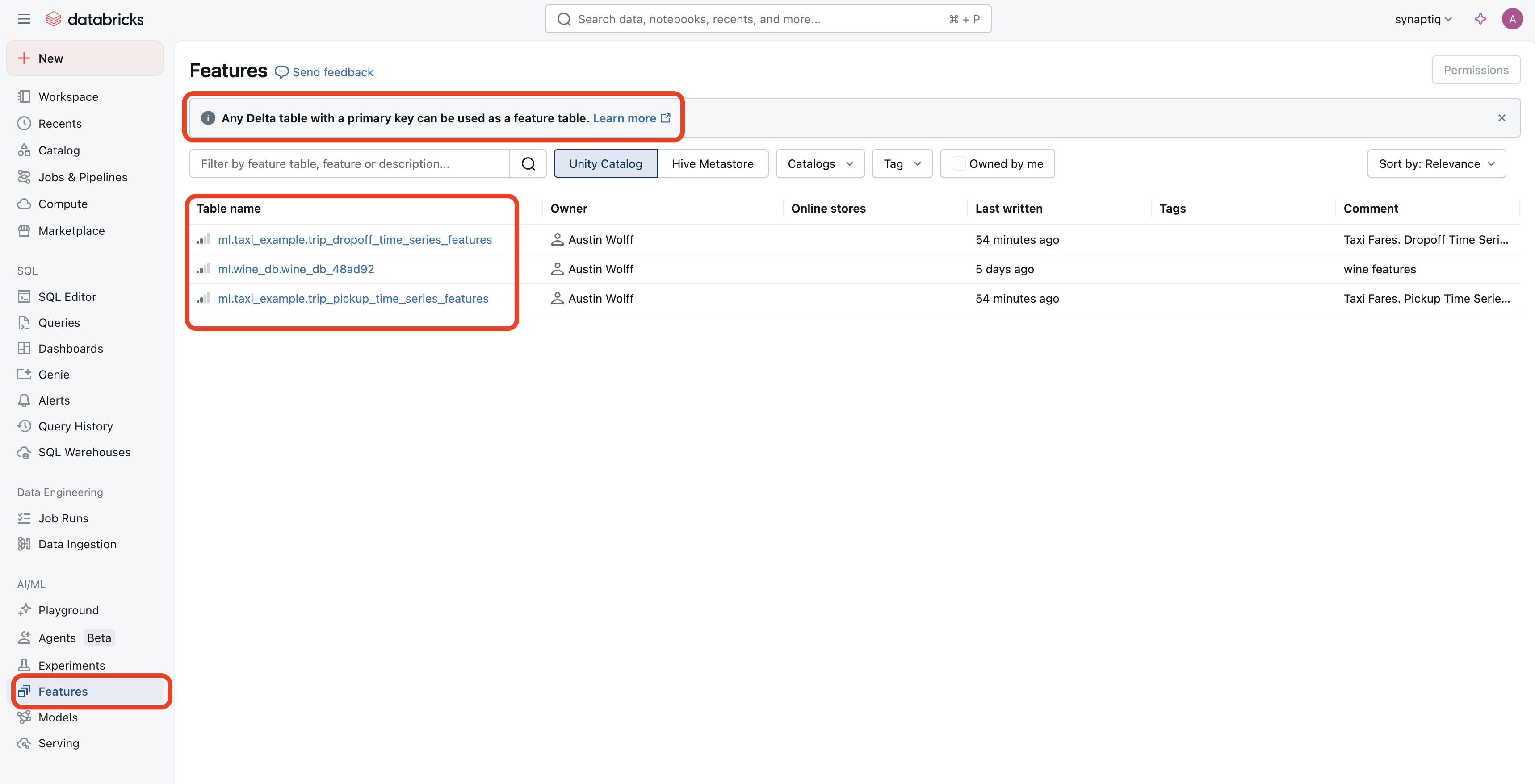 You can find your features table under the Features tab on Databricks’s left-hand menu: