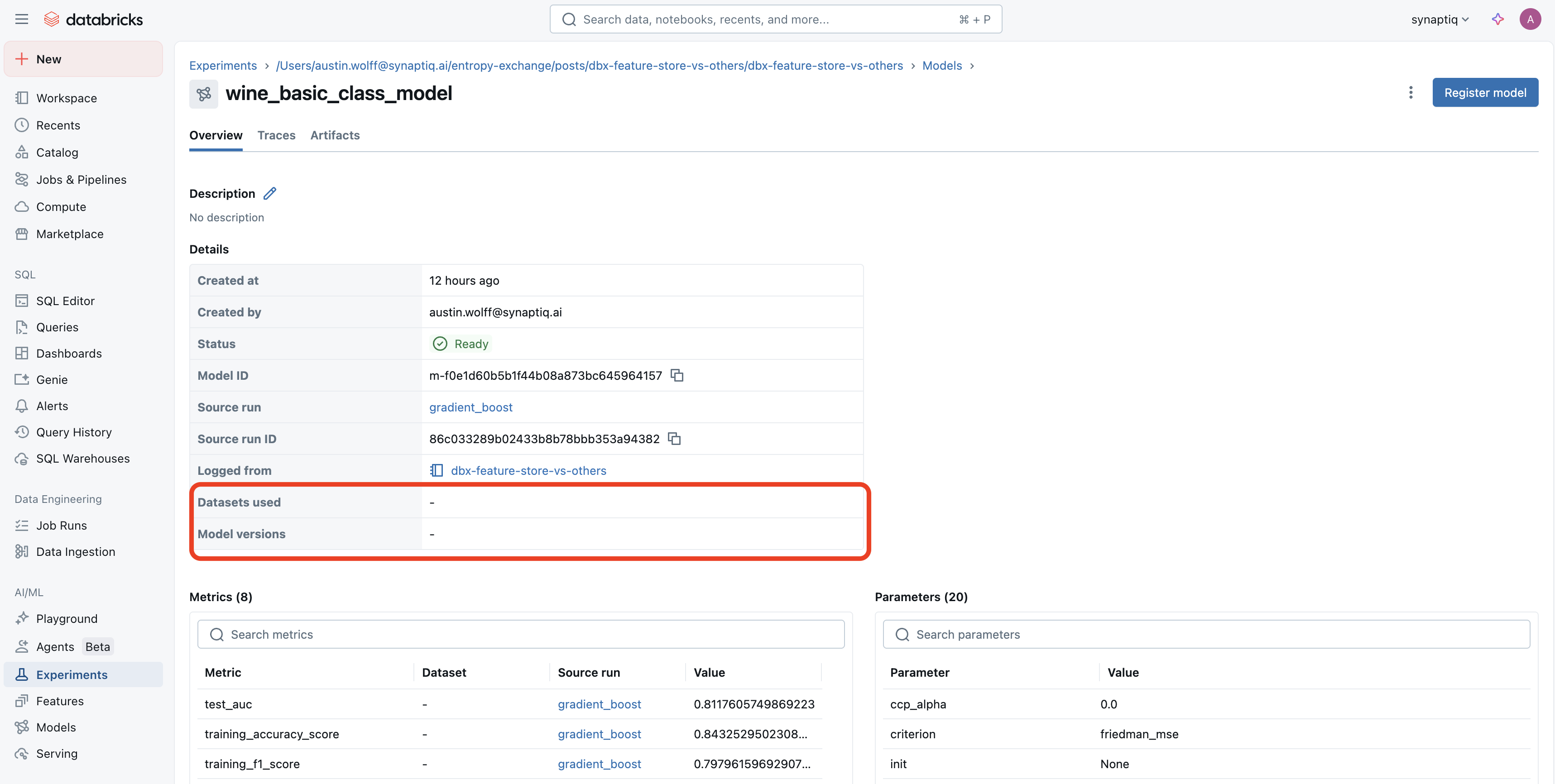 Contrast that with using a Feature Store and the Databricks Feature Engineering Client. When navigating to a model used in an experiment, we are taken here instead, which tells us which feature store was used (in addition to the model version):
